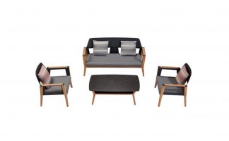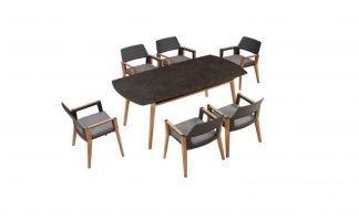 Il tocco naturale dei cosciali in teak burma massello, abbracciano le sedute in alluminio sagomate ad hock. I cuscini sfoderabili equipaggiano la seduta, e a richiesta anche il rivestimento dello schienale. Il tavolo è equipaggiato con un piano in vetroceramica particolarmente resistente agli agenti atmosferici e un comodo sottopiano fustellato in alluminio.